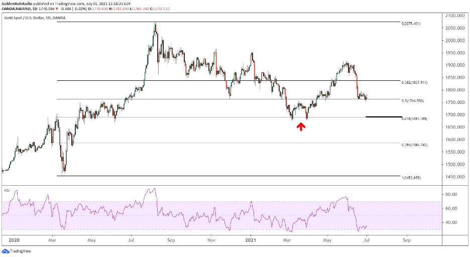 There are several bullish indicators that may delay gold’s third visit to the .618 Fib line (or cancel it altogether). The purple line on the chart below measures gold’s Relative Strength Index (RSI). RSI is a momentum indicator used to analyze when assets are overvalued or undervalued. When RSI drops below the light purple range, like this week, the indicator suggests that gold is undervalued. Low values on the Relative Strength Index make for strong entry points.