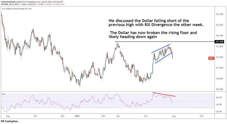 • The U.S. Dollar Index dropped below its rising channel after the RSI divergence last week, giving gold a boost.
