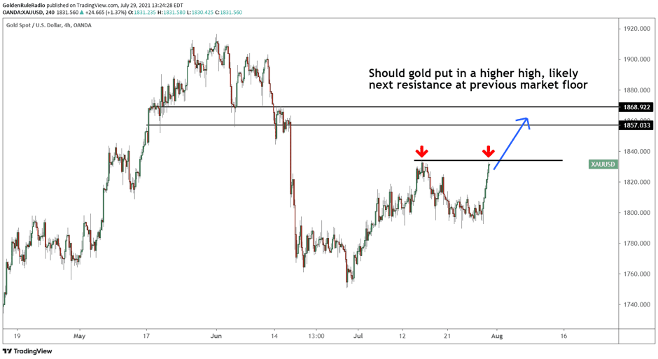 Despite the rally, gold has not yet risen above this month’s previous high of $1,832. To continue the stair stepping pattern, the price needs to put in a higher high and continue toward previous floors.