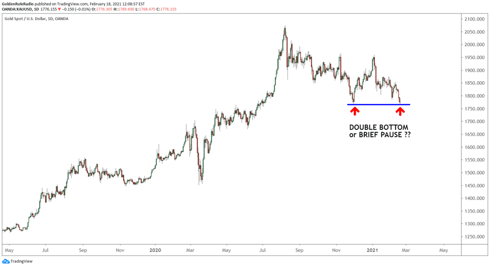 Since November, gold has been bouncing up and down between mid-$1,700s low to mid-$1,900 range. The price failed in a higher high at the key level of $1,960. Gold bulls would certainly like to see the line hold around $1,765 and then turn up, but history tells us that we could see lower prices.