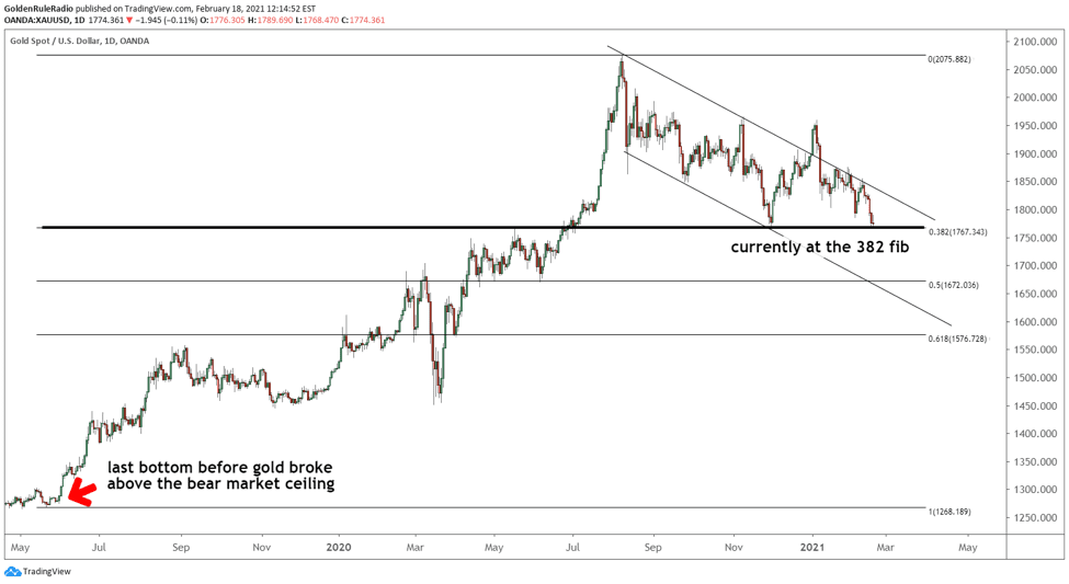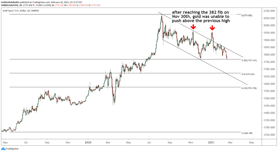 From a macro perspective, lower prices are not overly concerning. If we rewind to the start of the bull market in 2016 and draw Fibonacci retracement levels, we will see that gold is currently sitting at the most shallow correction zone (the .382 Fib). For that reason, gold still looks bullish, even if we continue the downward momentum for the time being.