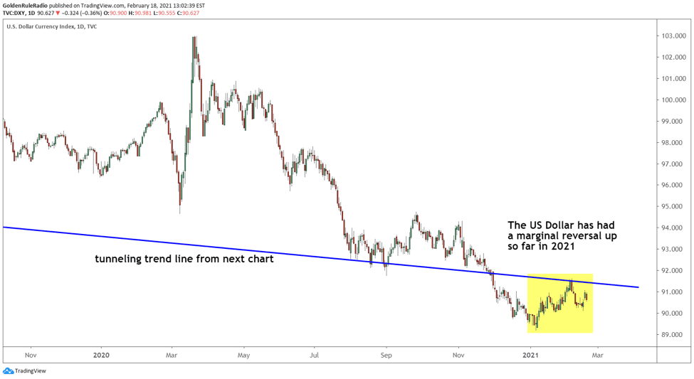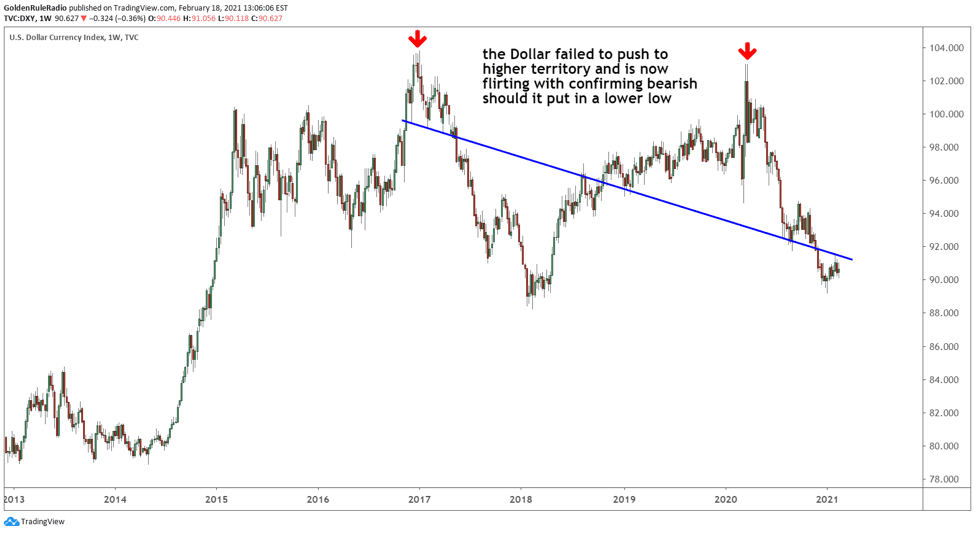 Zooming out a little, we see this loss of value in action. Last year, the Dollar failed to push above its early 2017 highs and has been locked in a downward pattern ever since. It is extremely unlikely we will see this pattern reverse, considering the government’s commitment to stimulus spending and the Fed’s target of increased inflation.