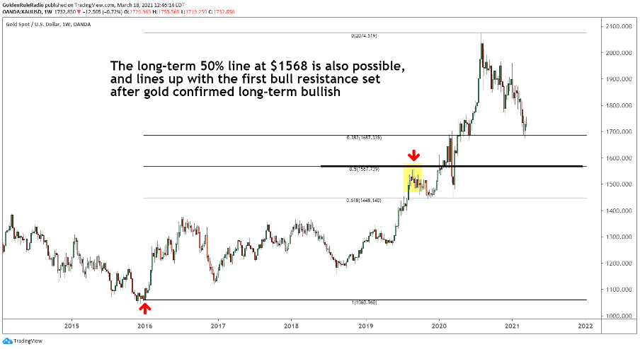 The charts below highlight other correction points we could possibly see in the coming months. The .382 fib is the most shallow potential long-term correction level. $1,568 is the 50% correction line. $1,445 is the long-term .618 fib and the bull market floor. It is unlikely we will see gold drop to that level, but it is certainly possible.
