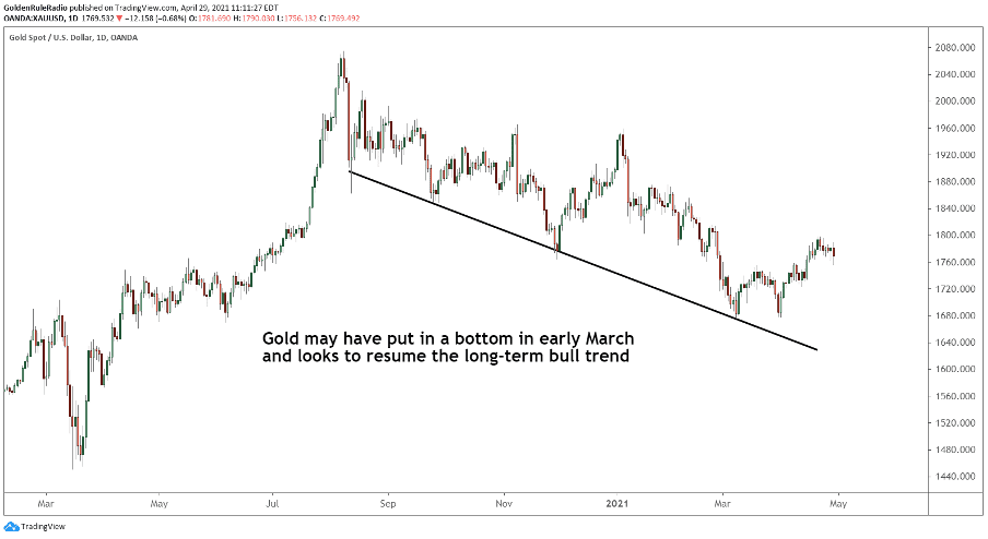 - Gold is desperately trying to break through $1,800 after a beautiful double bounce on the key $1,680 support level. Investors are anticipating a robust continuation of gold’s third great bull market.