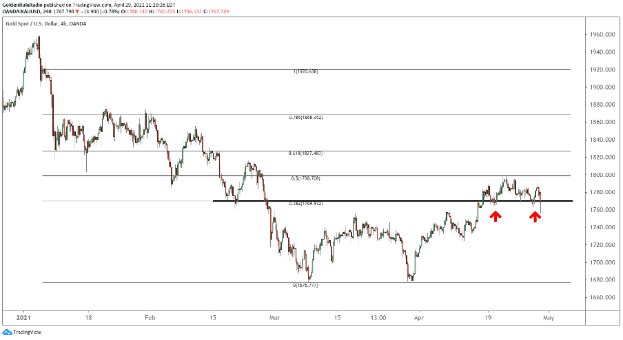 Gold is currently sitting around $1,765 following yesterday’s FOMC meeting, in which Federal Reserve Chairman Jerome Powell reiterated the Fed’s commitment to “keep interest rates near zero,” maintain “sizable asset purchases,” and deliver “powerful support to the economy until the recovery is complete.” In other words, the money will keep flowing.
