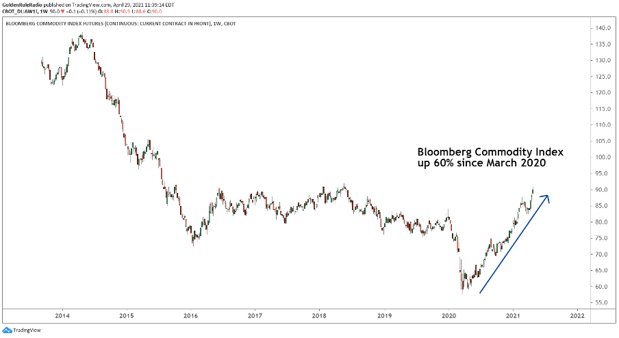 We have several ways of measuring the general price of commodities, such as the Bloomberg Commodities Index. However, it doesn’t take an experienced analyst to notice recent price increases. If you’ve been to the gas pump, purchased food at the grocery store, or heard anything about skyrocketing lumber prices, it probably comes as no surprise that the Bloomberg Commodities Index has been on the rise recently.