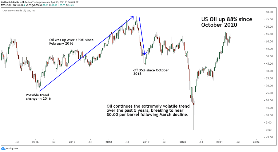 The chart below shows the extremely volatile trend of oil over the past five years. Higher gas prices put a heavy burden on your wallet, and are just one tiny sliver of the inflation story. Corn, soybean, wheat, and hog futures are all testing 8-year highs. Copper, steel, and lumber prices have reached record highs. Even coffee futures are surging.