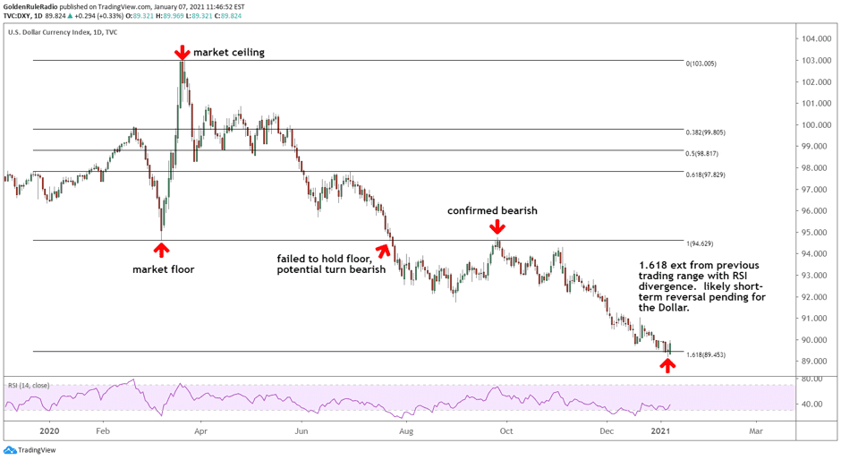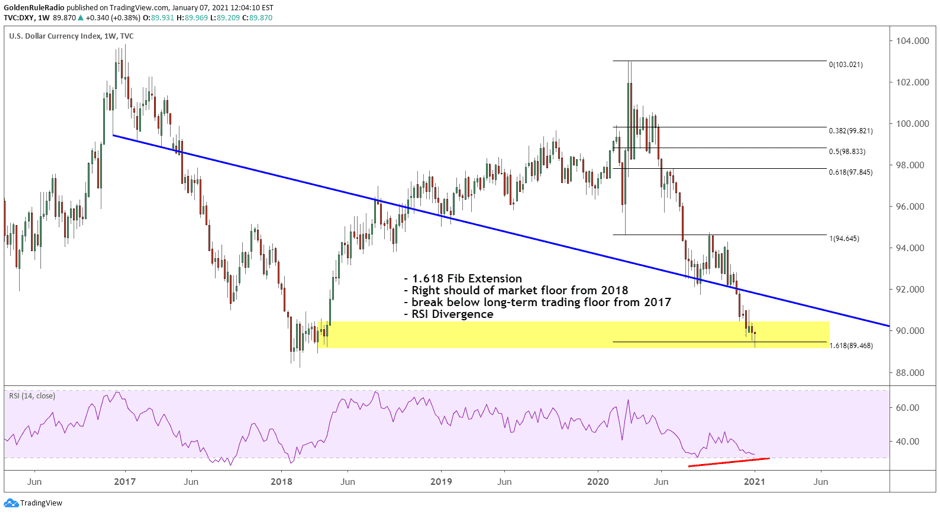 The U.S. Dollar started 2021 in a weak position. Below is a chart of the U.S. Dollar Index, which measures the strength of the Dollar against other major currencies. The Dollar index has dropped to its previous lows of early 2018, currently holding right at the 1.618 Fibonacci retracement level. Remember, gold is a hedge against currency devaluation, so a dropping dollar usually correlates with rising gold prices.