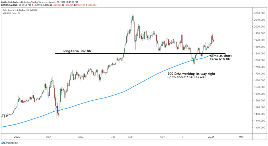 The long-term .382 Fib, short-term .618 Fib, and 200 day moving average all converged around the same price: 1840. This makes a strong argument for gold dropping down to those fundamental indicators in the next week or so. Drops like these provide excellent gold entry points but do not last very long. For investors hoping to add to their position, timing is key!